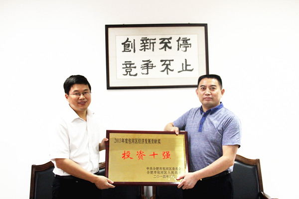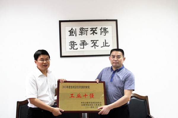 6月25日上午,區(qū)委常委、副區(qū)長謝軍等一行領(lǐng)導(dǎo)來公司調(diào)研走訪,近距離聽取企業(yè)心聲,幫助企業(yè)解決發(fā)展難題。在公司本部二樓會議室,董事長吳應(yīng)宏陪同來訪領(lǐng)導(dǎo)進(jìn)行座談,就公司近期生產(chǎn)經(jīng)營狀況、后期發(fā)展等情況進(jìn)行溝通和交流,座談會氣氛融洽而熱烈。同時會上,謝區(qū)長為董事長頒發(fā)2013年度包河區(qū)經(jīng)濟(jì)發(fā)展貢獻(xiàn)獎投資十強(qiáng)、工業(yè)十強(qiáng)、納稅二十強(qiáng)企業(yè)獎。