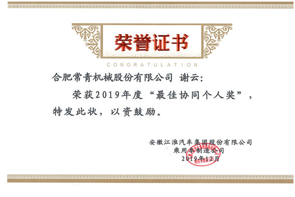 2019年12月10日,江淮汽車2020年供應(yīng)商大會在合肥豐大國際酒店隆重召開,會議期間對合作突出的供應(yīng)商進行表彰。我公司榮獲2019年度“優(yōu)秀供應(yīng)商”、“量產(chǎn)貢獻獎”榮譽稱號。桃花一公司技術(shù)質(zhì)量部副部長解云獲江淮乘用車公司“最佳協(xié)同個人獎” 榮譽稱號。
