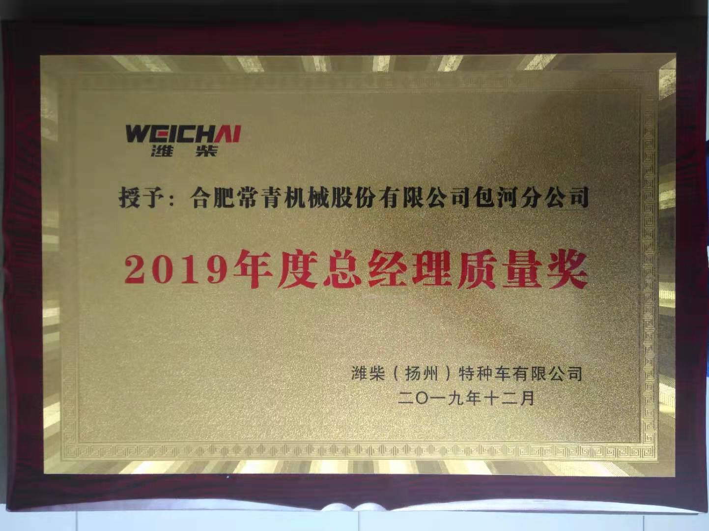 合肥常青機械股份有限公司包河分公司喜獲2019年度 濰柴特車“總經(jīng)理質(zhì)量獎”