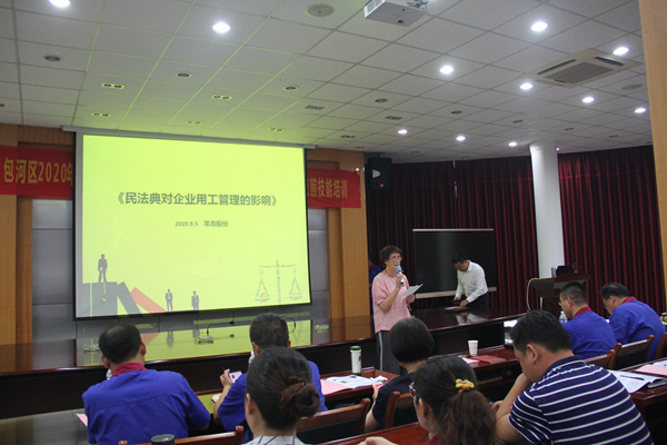 9月5日,在包河分公司圓形會(huì)議室,公司管理層培訓(xùn)第一堂課正式開課,特別邀請(qǐng)公司法律顧問昊華律師事務(wù)所主任胡敏,為大家送上一趟精彩的法律精神大餐,重點(diǎn)培訓(xùn)民法典對(duì)企業(yè)用工管理的影響,胡律師圍繞“民典法與企業(yè)勞動(dòng)用工關(guān)系及運(yùn)用”等方面進(jìn)行了深入淺出的講解,同時(shí),運(yùn)用日常生活中常見的案例和通俗易懂的語言,為160余名參培人員上了一堂生動(dòng)的普法教育課。