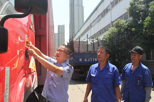 頂著炎炎烈日,殷隊(duì)長(zhǎng)來(lái)到生產(chǎn)現(xiàn)場(chǎng),為貨車(chē)駕駛員現(xiàn)場(chǎng)示范如何在貨車(chē)上張貼攜帶的“右轉(zhuǎn)停三秒 交通事故少”宣傳貼。