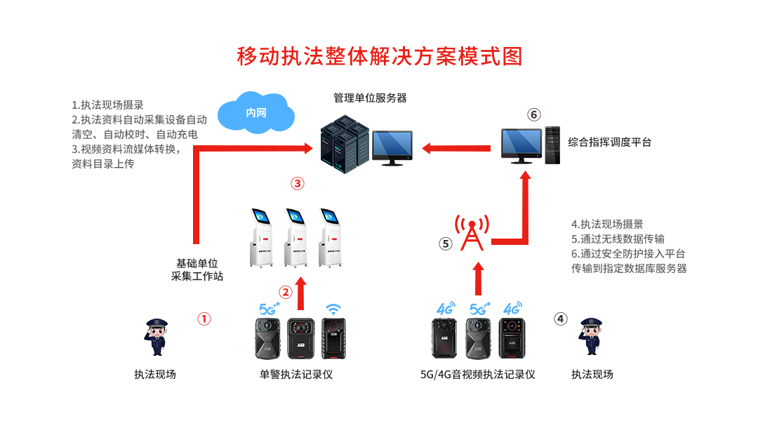 *該方案契合雪亮工程提出治安防控“全覆蓋、無死角”的要求,一線執(zhí)法人員通過執(zhí)法記錄儀以第一視角記錄將現(xiàn)場的動態(tài)反饋到指揮中心。執(zhí)法記錄儀對執(zhí)法活動實行移動拍攝,彌補了監(jiān)控攝像頭固定式的拍攝盲區(qū),實現(xiàn)執(zhí)法記錄儀+高清監(jiān)控攝像頭有機結(jié)合,更加客觀、全面、真實的反映執(zhí)法全過程。