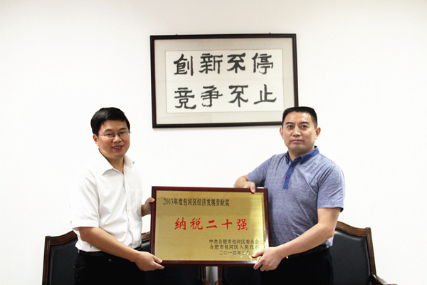 6月25日上午,區(qū)委常委、副區(qū)長謝軍等一行領(lǐng)導(dǎo)來公司調(diào)研走訪,近距離聽取企業(yè)心聲,幫助企業(yè)解決發(fā)展難題。在公司本部二樓會議室,董事長吳應(yīng)宏陪同來訪領(lǐng)導(dǎo)進(jìn)行座談,就公司近期生產(chǎn)經(jīng)營狀況、后期發(fā)展等情況進(jìn)行溝通和交流,座談會氣氛融洽而熱烈。同時會上,謝區(qū)長為董事長頒發(fā)2013年度包河區(qū)經(jīng)濟(jì)發(fā)展貢獻(xiàn)獎投資十強(qiáng)、工業(yè)十強(qiáng)、納稅二十強(qiáng)企業(yè)獎。
