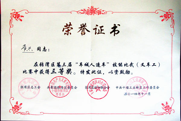 十堰常森公司通報(bào)表彰在張灣區(qū)技能比武大賽榮獲“叉車工技能比武三等獎(jiǎng)”等三項(xiàng)榮譽(yù)員工黃興