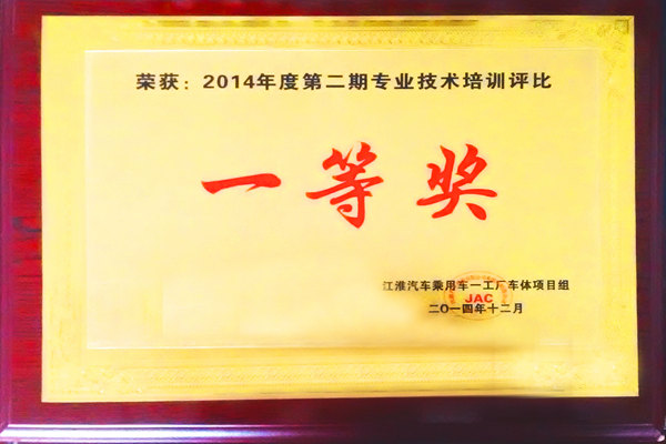 衛(wèi)贏飛榮獲江淮乘用車一公司“2014年度第二期專業(yè)技術培訓評比一等獎”