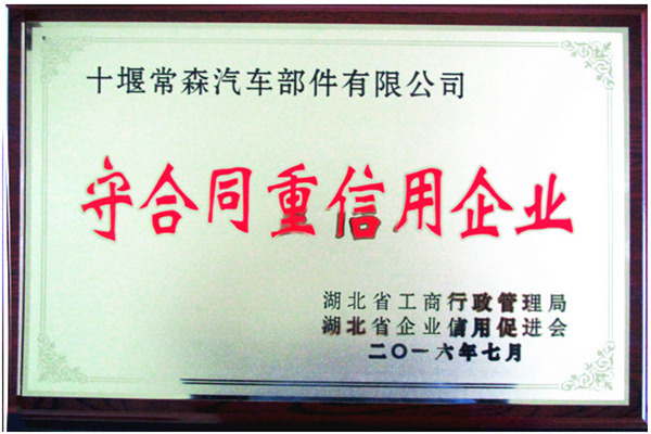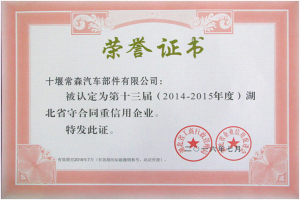 近日,常森汽車部件有限公司被湖北省工商行政管理局、湖北省企業(yè)信用促進(jìn)會(huì)評(píng)為“2014-2015年度守合同重信用企業(yè)”