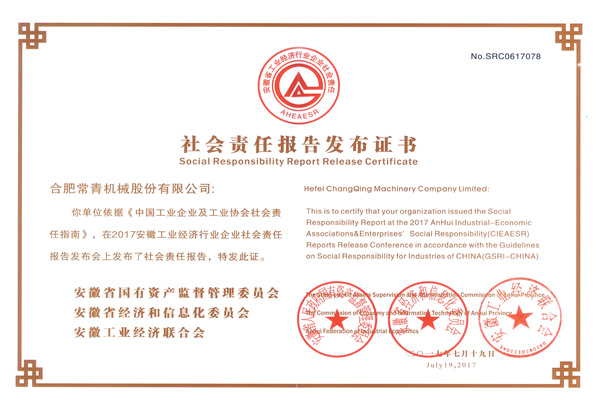 2017年7月19日,2017安徽省企業(yè)社會(huì)責(zé)任報(bào)告發(fā)布會(huì)在合肥豐大國際大酒店隆重召開,合肥常青機(jī)械股份有限公司與到會(huì)的全省75家企業(yè)聯(lián)袂發(fā)布了《2016年社會(huì)責(zé)任報(bào)告》,并榮獲“企業(yè)責(zé)任報(bào)告”發(fā)布證書。中國工業(yè)經(jīng)濟(jì)聯(lián)合會(huì)社會(huì)責(zé)任促進(jìn)中心主任王曉光出席發(fā)布會(huì)并致辭。