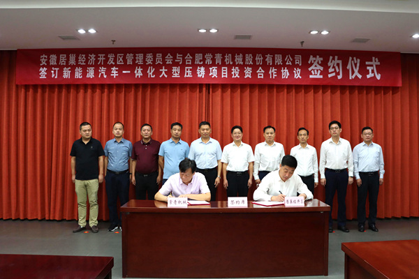 公司新能源汽車一體化大型壓鑄項目位于安徽居巢經(jīng)開區(qū)夏閣園區(qū),總用地面積300畝,一期用地95畝,項目將新建自動化制造設(shè)備、試驗區(qū)、辦公樓及生活配套區(qū),主要產(chǎn)品包括汽車壓鑄件、冷熱沖壓及焊接零部件。一期達產(chǎn)后將形成年產(chǎn)20萬件新能源一體化零部件規(guī)模,同時將帶動周邊200余人就業(yè)。會上,市長汪功勝代表市委、市政府對常青股份此次在巢投資興業(yè)表示熱力歡迎,同時也從“人緣”、“地緣”和“業(yè)緣”等方面闡述了巢湖市與常青股份公司合作潛質(zhì),并表示一定做好各項服務(wù)工作,確保項目早日開花結(jié)果。