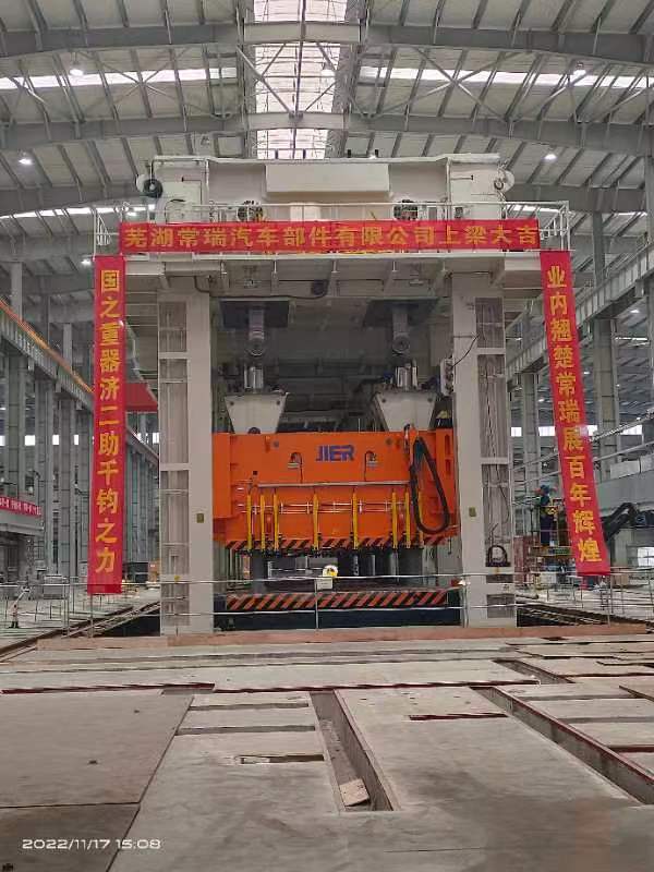 10點(diǎn)18分,禮炮齊鳴,禮花綻放。隨著黃云擲地有聲地宣布“上梁儀式正式開(kāi)始”后,壓機(jī)橫梁徐徐上升慢慢移動(dòng)并順利就位,與壓機(jī)四立柱平穩(wěn)銜接,連桿對(duì)接完成,常瑞二期項(xiàng)目A線2400噸伺服壓機(jī)上梁儀式圓滿成功,標(biāo)志著蕪湖常瑞二期工廠A線正式進(jìn)入大型覆蓋件的投產(chǎn)階段。