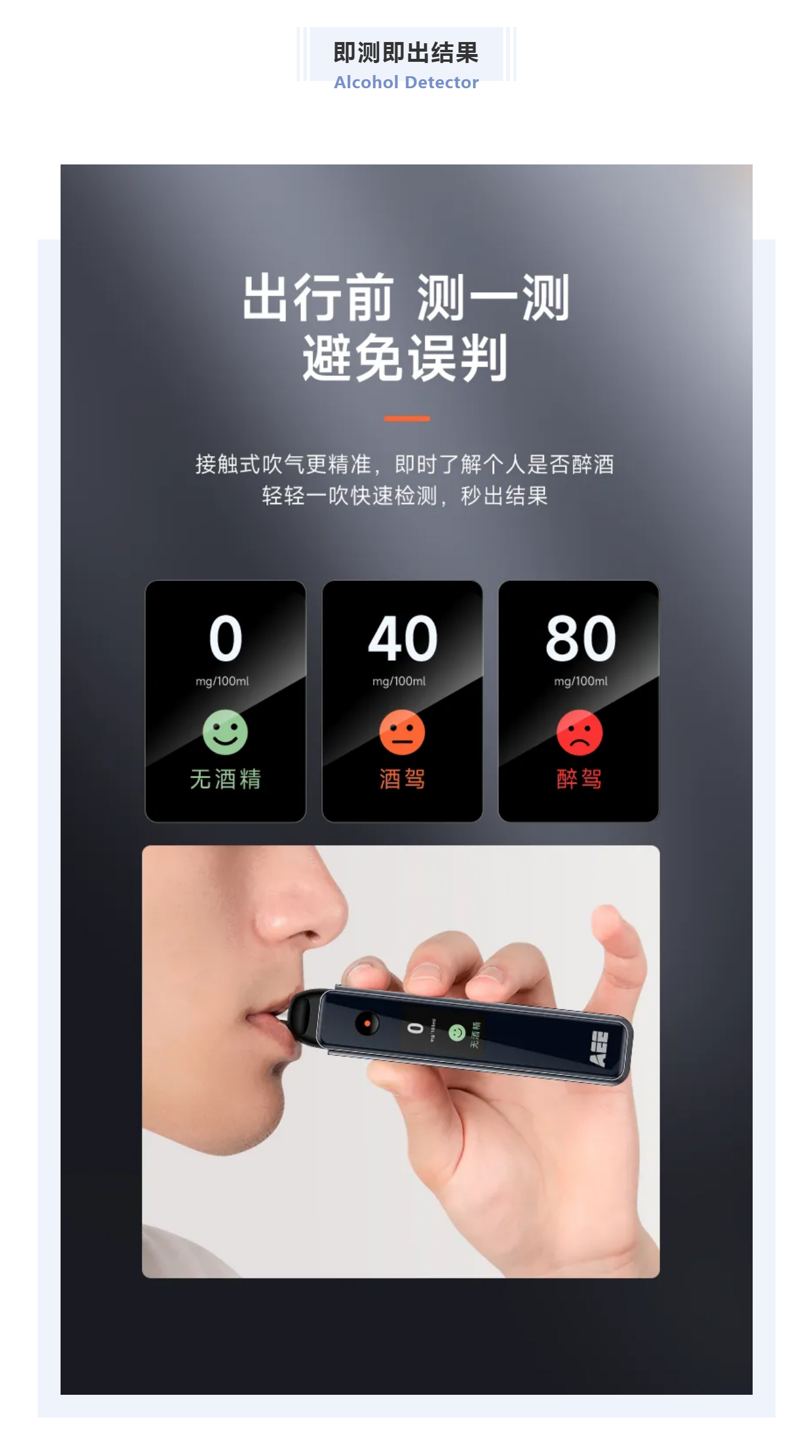 酒檢知音A1是一款高顏值、技術(shù)先進的產(chǎn)品,采用警用電化學傳感器,測量精度達1mg/100ml,能迅速準確測量呼吸中的酒精含量,吹氣5秒提供可靠檢測結(jié)果,輔助判斷是否適合駕車。同時,A1一次充電可測200次,具備語音播報和高清顯示屏,檢測結(jié)果一目了然,通過APP 可以查看歷史記錄并打印,精準高效實用,且無需定期校準。
